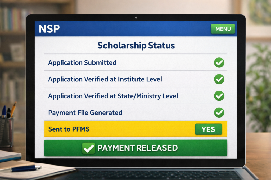 NSP Scholarship 2025-26 payment status shows whether your scholarship has been approved, sent to PFMS, or credited to your bank account. Students can check it on the NSP portal or PFMS website using their application or bank details.